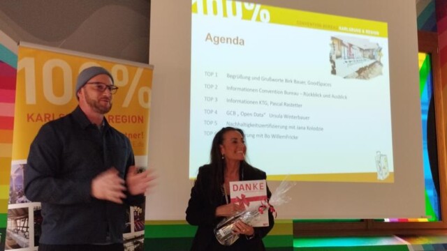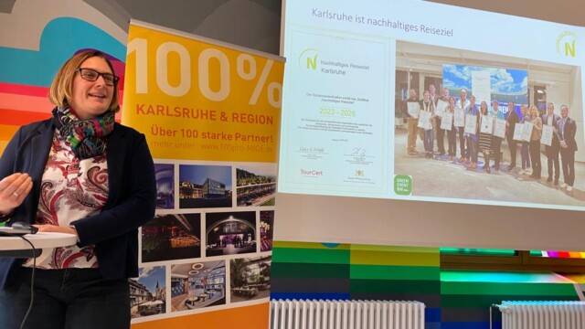Jana Kolodzie (Abteilungsleiterin Touristische Entwicklung der KTG Karlsruhe Tourismus GmbH) berichtete, dass die Reisedestination Karlsruhe im Oktober 2023 die heiß ersehnte Zertifizierung „Nachhaltiges Reiseziel“, vergeben von der Zertifizierungsagentur TourCert, erhalten hat. Eine Auszeichnung, die die kontinuierliche Bemühung krönt, Karlsruhe zu einem der nachhaltigsten Städtereiseziele Deutschlands zu entwickeln.