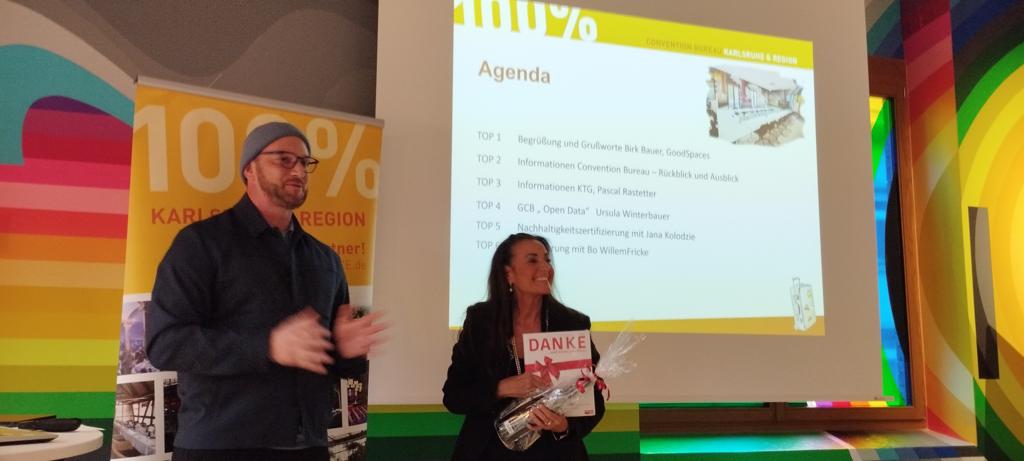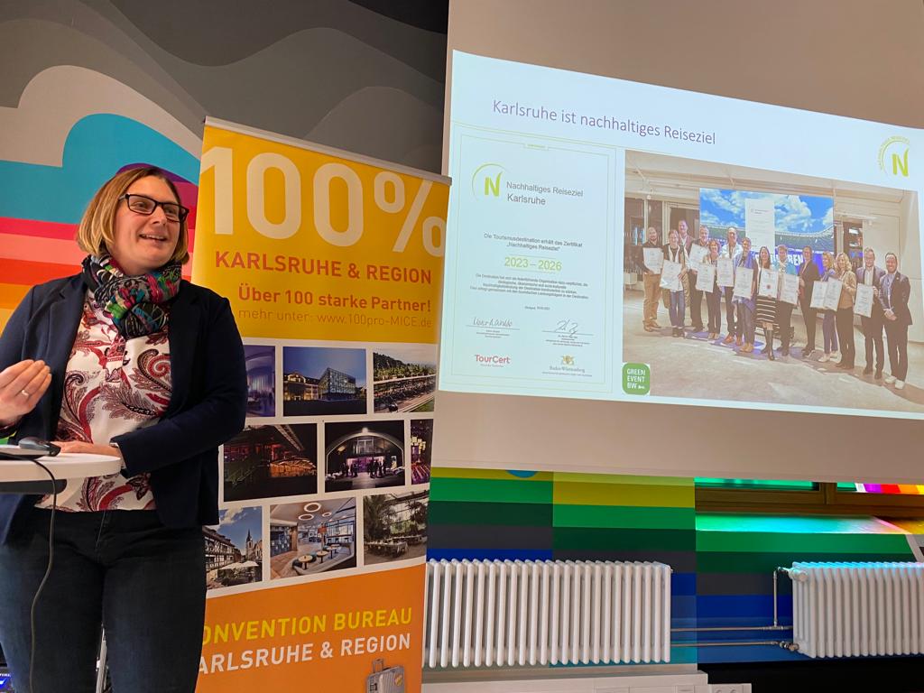 Jana Kolodzie (Abteilungsleiterin Touristische Entwicklung der KTG Karlsruhe Tourismus GmbH) berichtete, dass die Reisedestination Karlsruhe im Oktober 2023 die heiß ersehnte Zertifizierung „Nachhaltiges Reiseziel“, vergeben von der Zertifizierungsagentur TourCert, erhalten hat. Eine Auszeichnung, die die kontinuierliche Bemühung krönt, Karlsruhe zu einem der nachhaltigsten Städtereiseziele Deutschlands zu entwickeln.