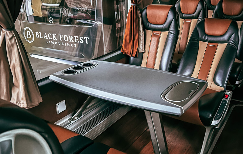 Der Bus überzeugt durch große Sicherheit, edles Design, Funktionalität und Komfort. Die Privacy-Verglassung schützt vor neugierigen Blicken. Auch sonst besitzt das Fahrzeug alles für eine komfortable Fahrt: Verstellbare Ledersitze, Panorama-Glasdach, Konferenzbereich, Steckdosen, Heißluftofen, Küche mit Nespresso Kaffeemaschine, WLAN, sogar Apple-TV ist an Bord. Inhalte lassen sich bequem mit dem Tablets oder Smartphones über HDMI-Anschluss oder Air-Play auf die Bildschirme des Fahrzeugs übertragen.